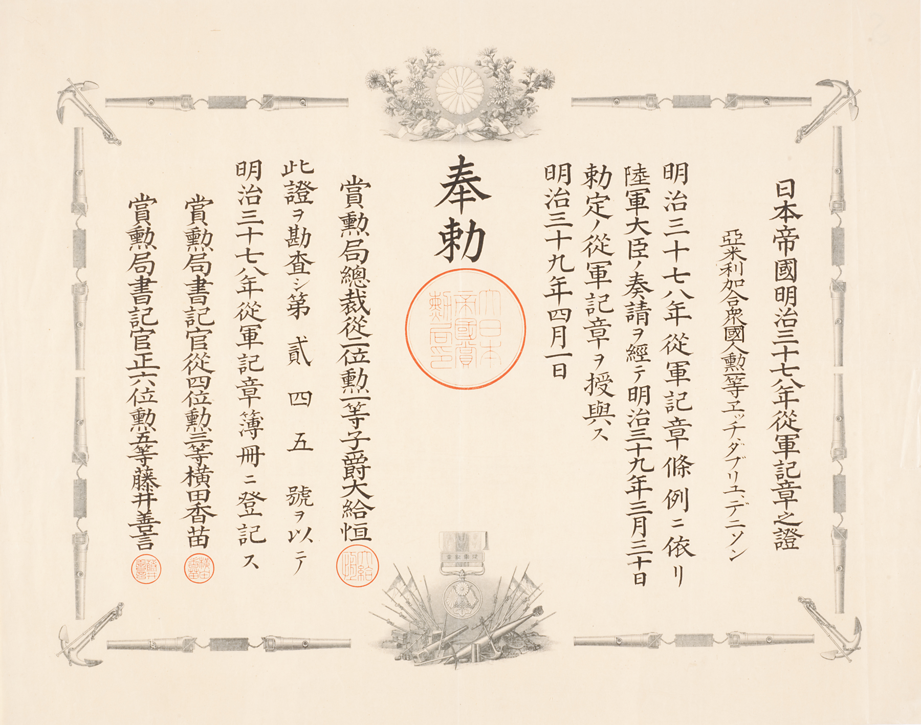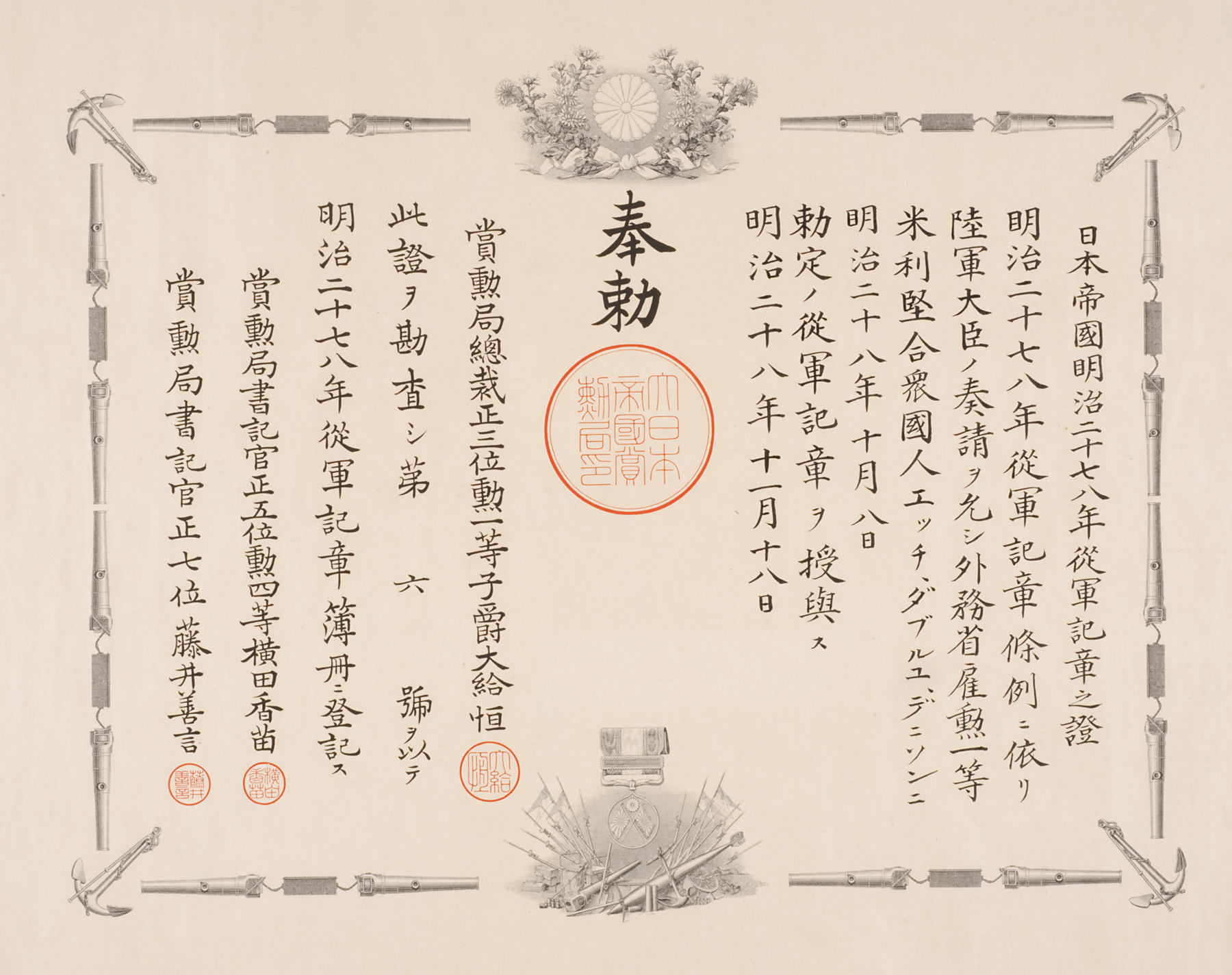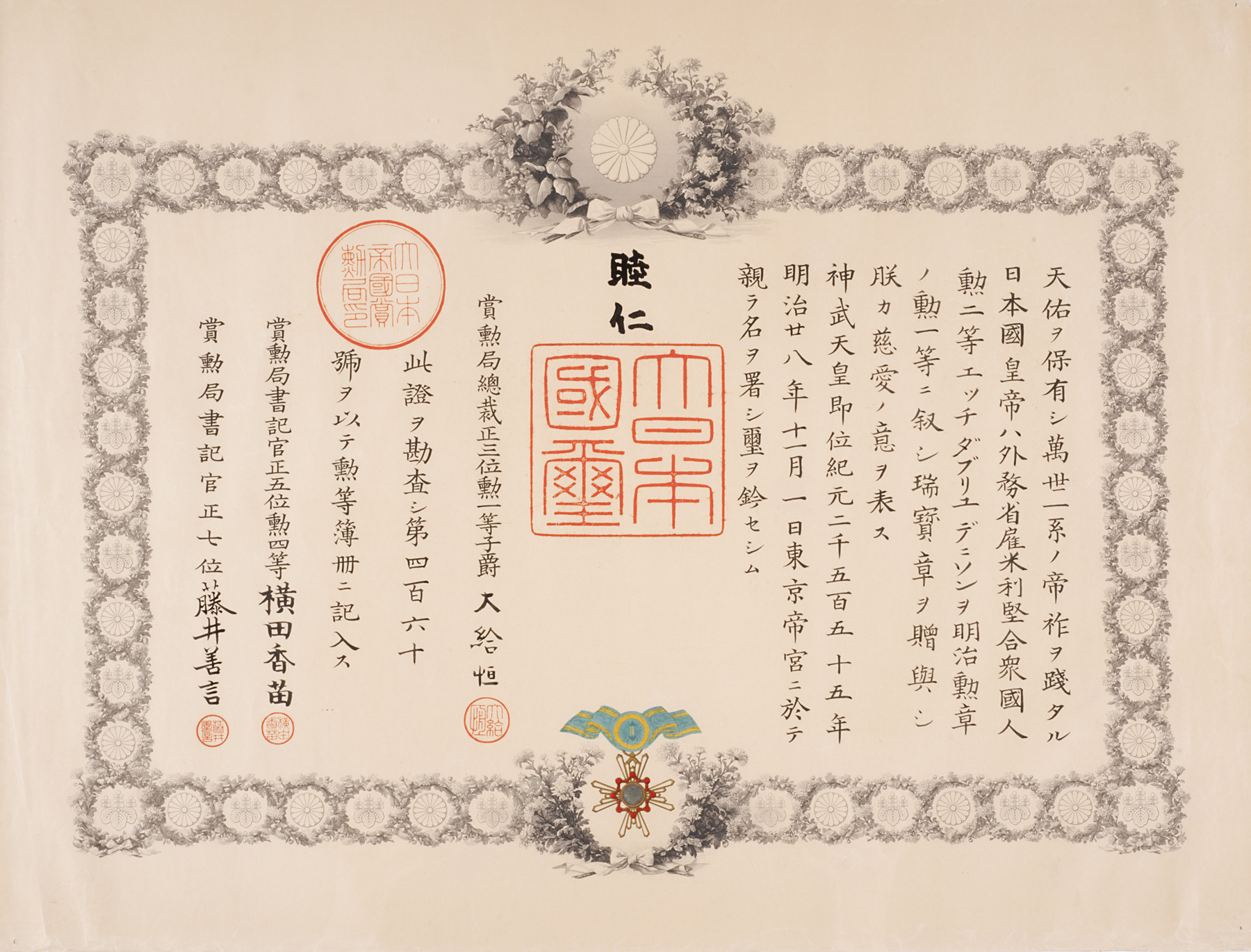 瑞宝章 Zuihōshō (First Class Medal of the Order of the Sacred Treasure), November 1, 1895, Meiji period (1868–1912)
