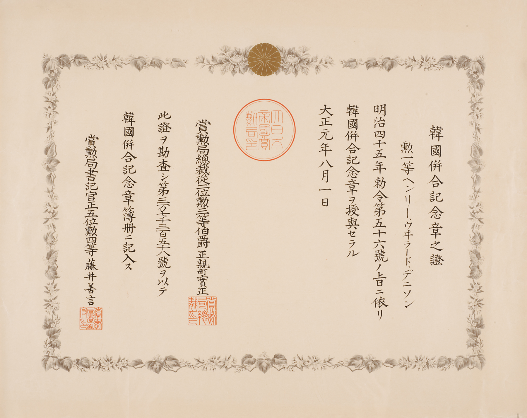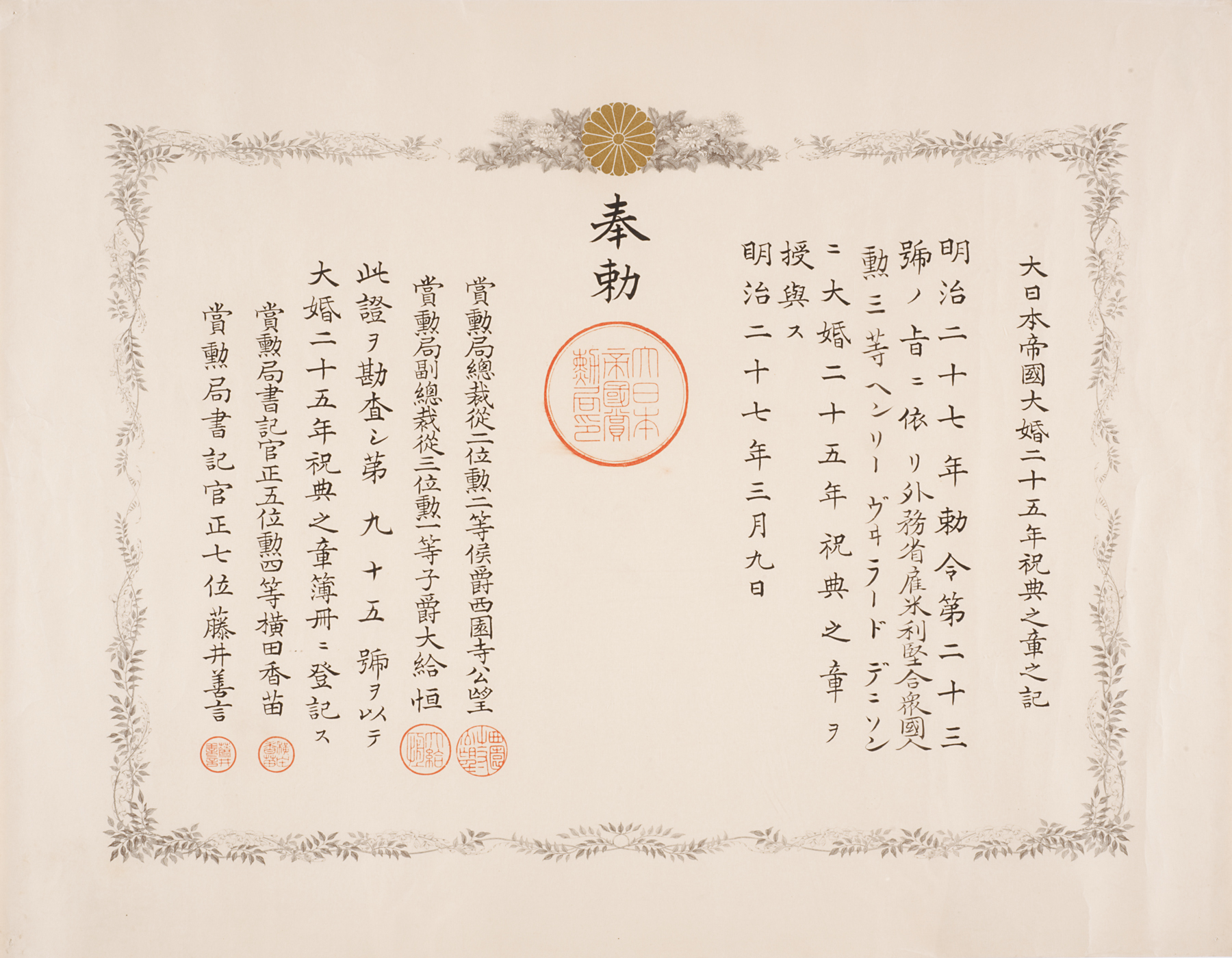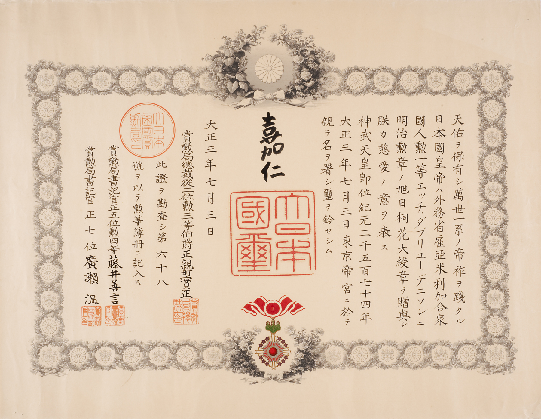 瑞宝章 Zuihōshō (First Class Medal of the Order of the Sacred Treasure), November 1, 1895, Meiji period (1868–1912)