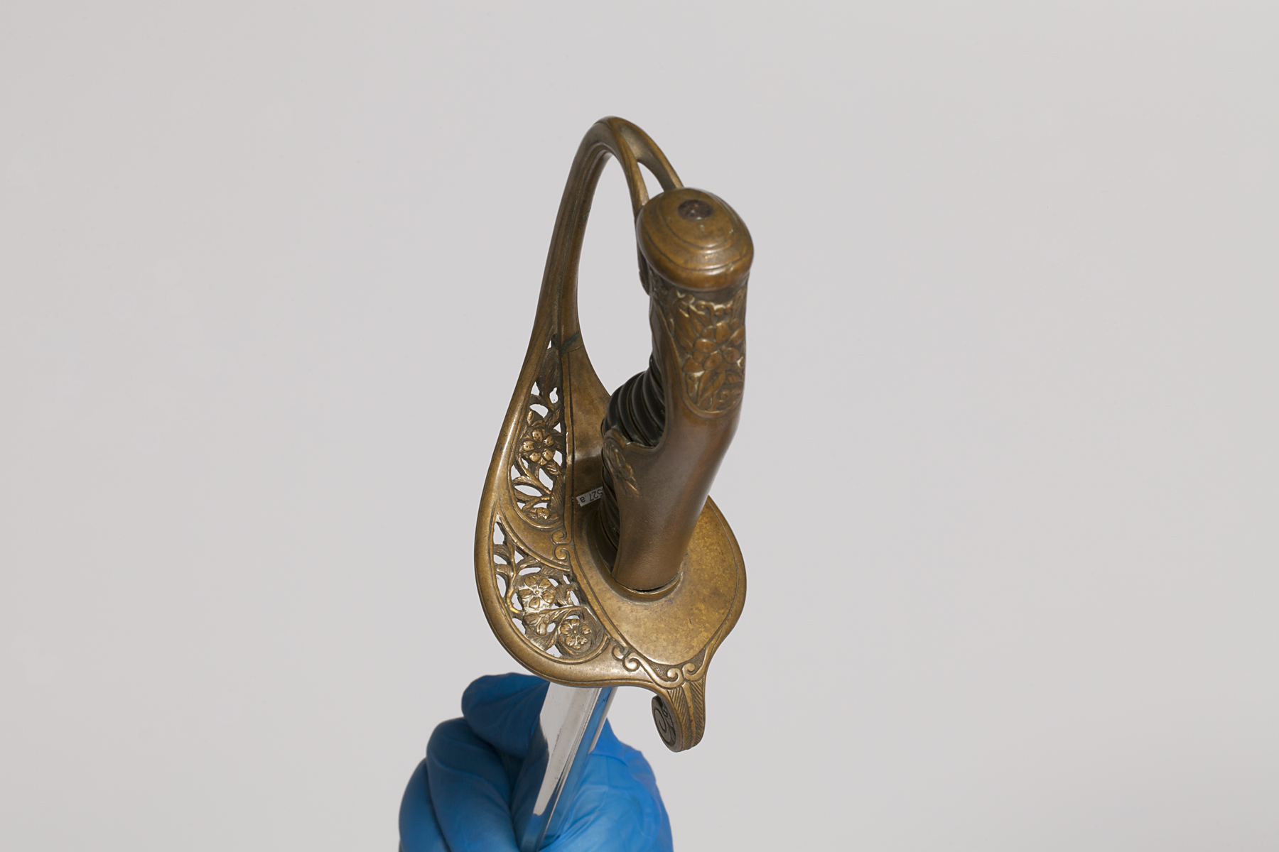 Material/technique: metal; carving; wood; wire; incising; ribbon