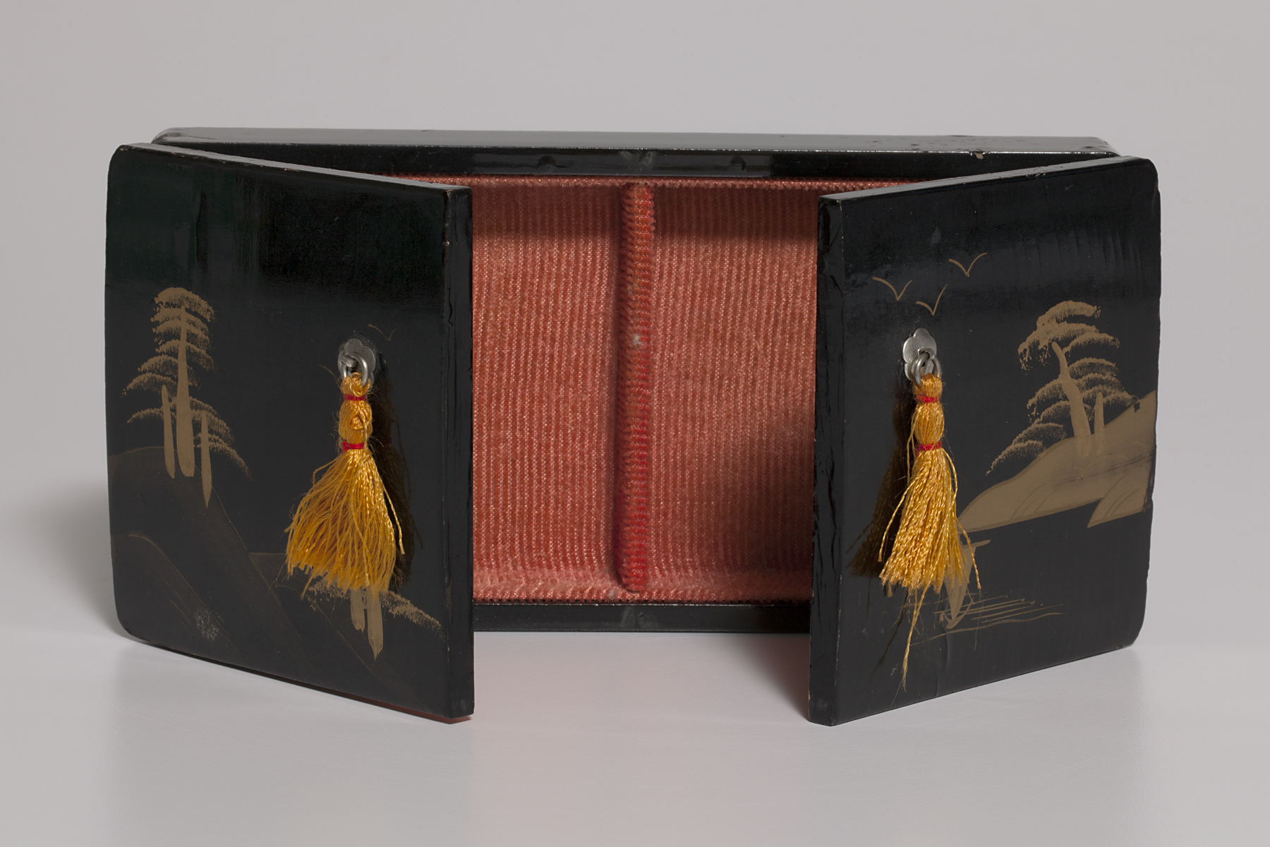 Material/technique: cloth; dyeing; wood; string; lacquer; paint; metal
